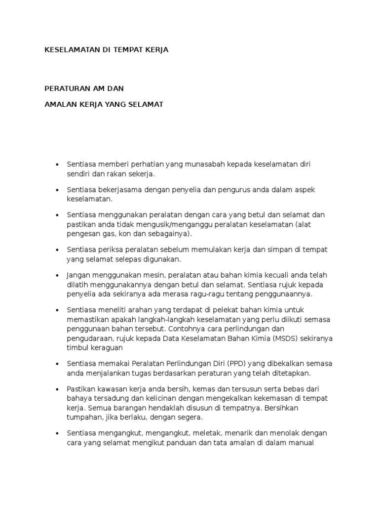 Https Jpbdselangor Gov My En Agensi Kerajaan Jpbds S Publication Download Other Report Manual Keselamatan Kesihatan Pekerjaan 1 551 Manual Keselamatan Dan Kesihatan Pekerjaan 1 File Html from Membudayakan keselamatan kerja seringkali menjadi momok bahwa membudayakan keselamatan kerja adalah sesuatu yang sulit. Keselamatan kerja telah menjadi perhatian di kalangan pemerintah dan bisnis sejak lama. Untuk memastikan perniagaan anda patuh, hubungi organisasi pemerintah yang menjaga standard keselamatan tempat kerja di kawasan anda. Keselamatan kerja dapat dicapai dengan bekerja dan menggunakan alat kerja sesuai sop yang berlaku, serta menjaga tempat kerja agar memiliki potensi bahaya yang minim. 1970, tujuan keselamatan kerja dan kesehatan kerja, usaha usaha perlindungan keselamatan kerja. 1) lepaskan selang karet dari dinding tabung alat pemadam. Keselamatan kerja setiap orang harus terjami di tempat kerja. Menurut beberapa sumber terungkap bahwa.